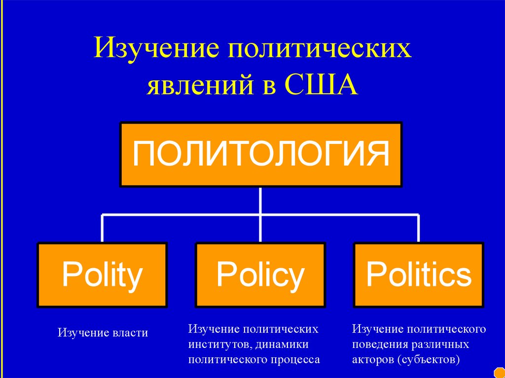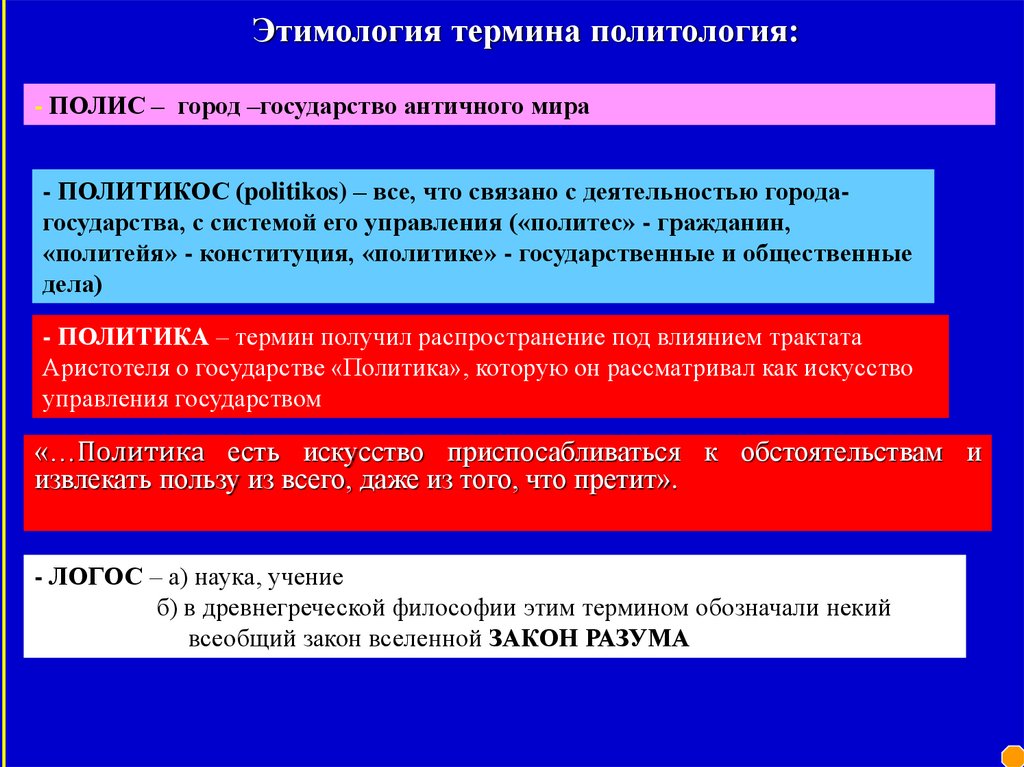 Этимология термина политология:- ПОЛИС – город –государство античного мира