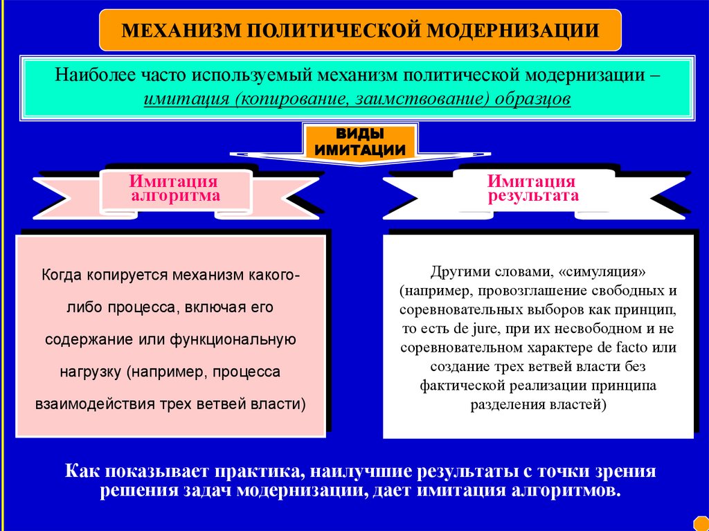 МЕХАНИЗМ ПОЛИТИЧЕСКОЙ МОДЕРНИЗАЦИИНаиболее часто используемый механизм политической модернизации –