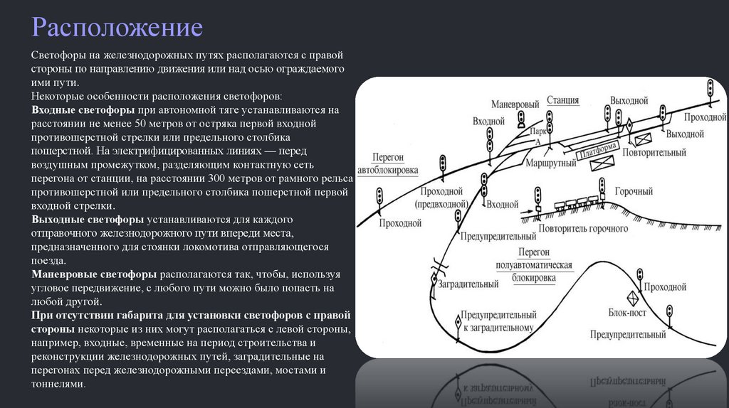 РасположениеСветофоры на железнодорожных путях располагаются с правой