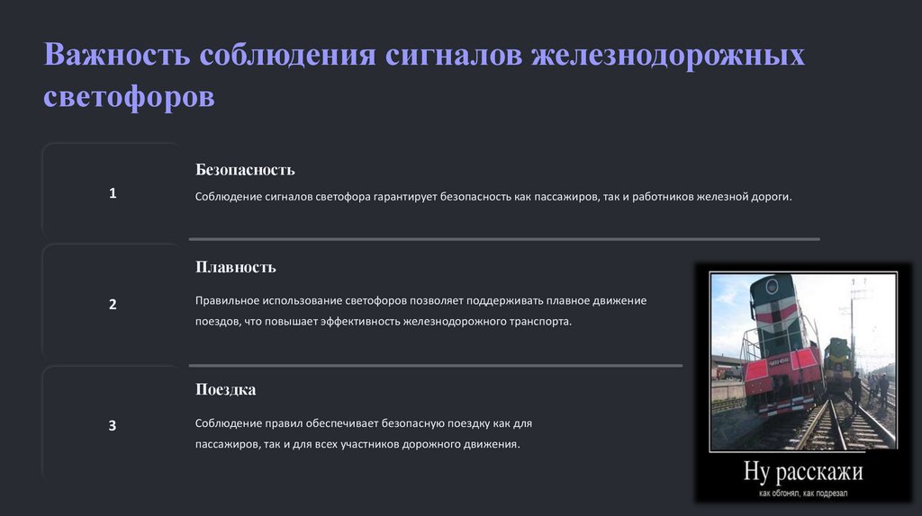 Соблюдение сигналов светофора гарантирует безопасность как пассажиров, так и работников железной дороги.
