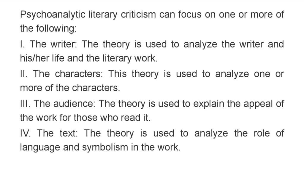 Psychoanalytic literary criticism can focus on one or more ofthe following: