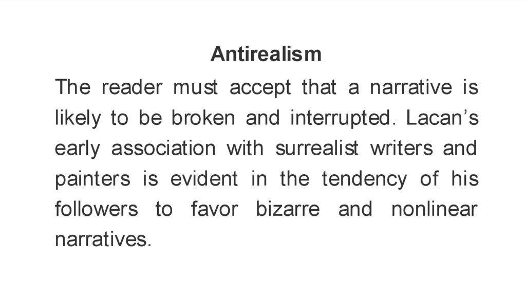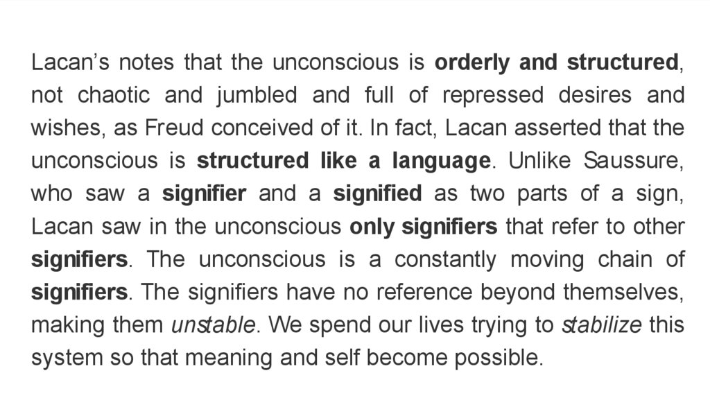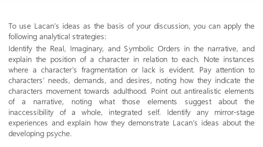 To use Lacan’s ideas as the basis of your discussion, you can apply thefollowing analytical strategies: