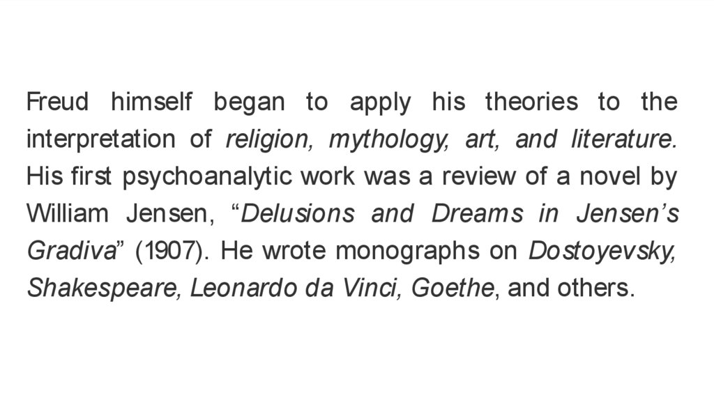 Freud himself began to apply his theories to theinterpretation of religion, mythology, art, and literature.