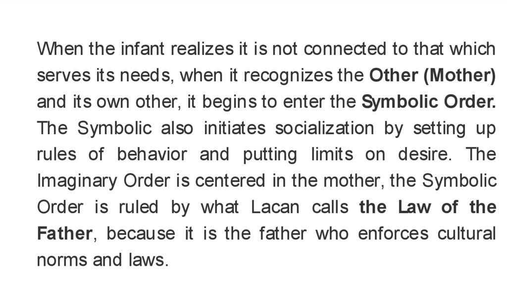 When the infant realizes it is not connected to that whichserves its needs, when it recognizes the Other (Mother)