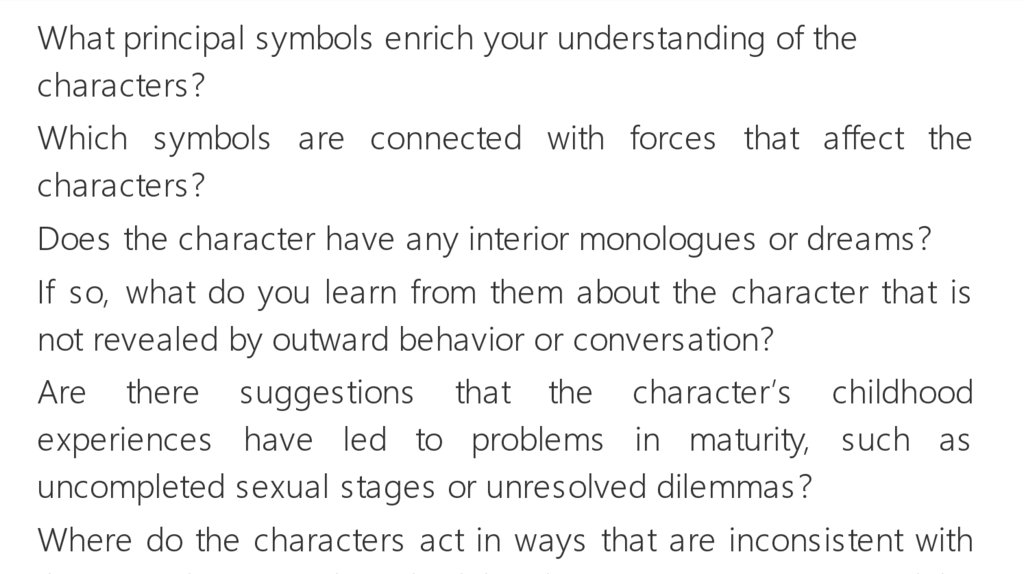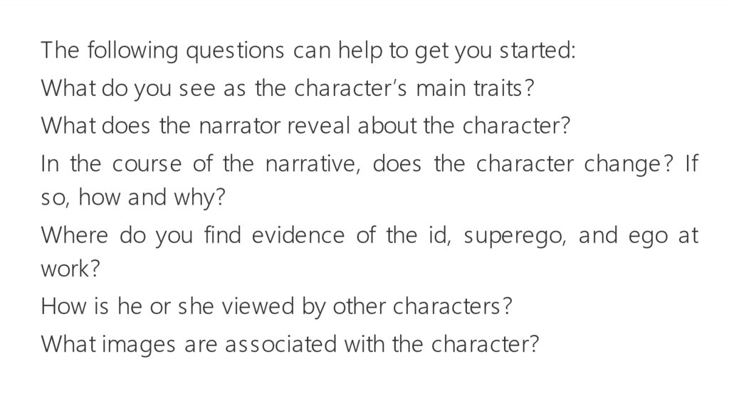The following questions can help to get you started:What do you see as the character’s main traits?