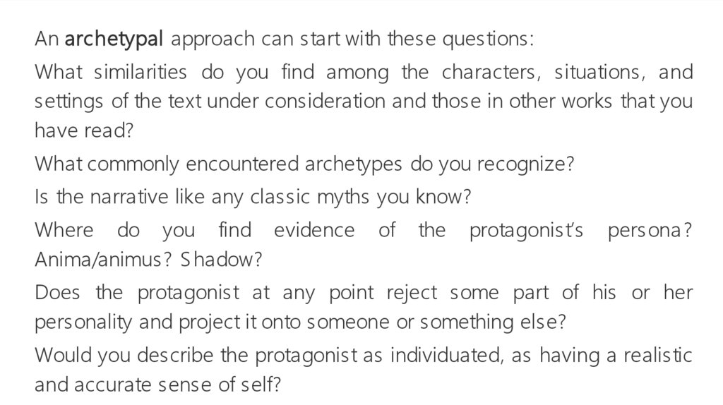 An archetypal approach can start with these questions:What similarities do you find among the characters , situations , and
