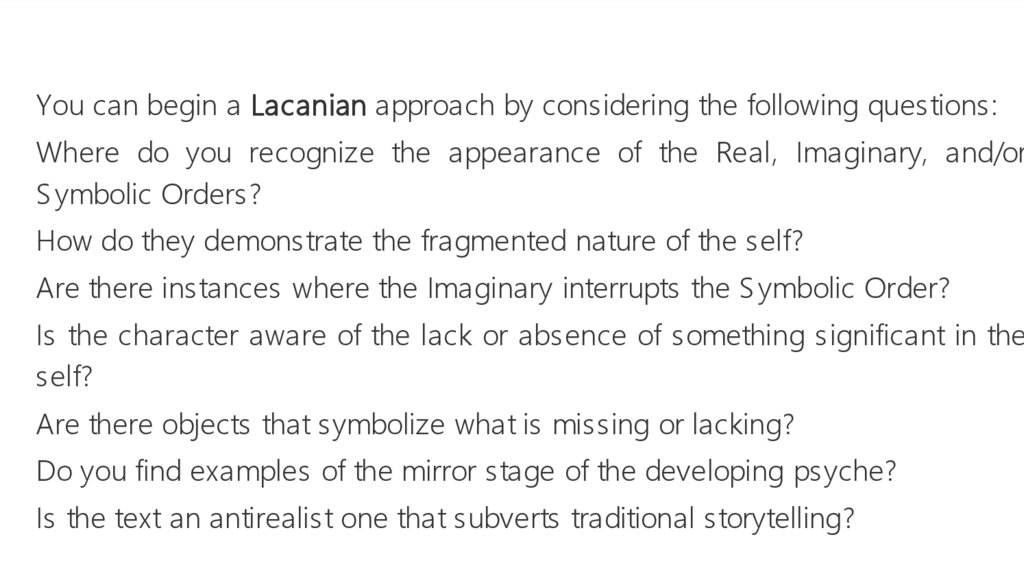 You can begin a Lacanian approach by considering the following questions:Where do you recognize the appearance of the Real, Imaginary, and/or