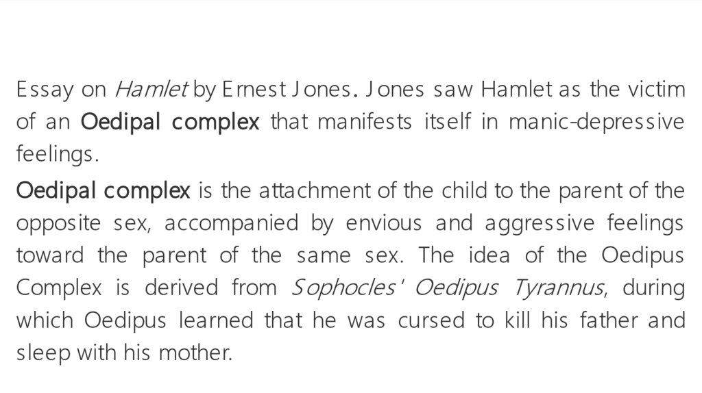 Essay on Hamlet by E rnest J ones . J ones saw Hamlet as the victimof an Oedipal complex that manifests itself in manic-depressive