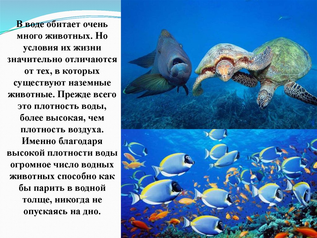 В воде обитает оченьмного животных. Но