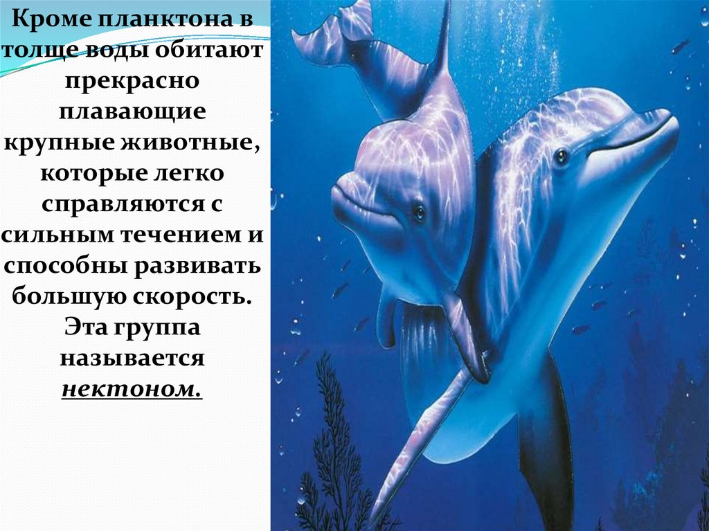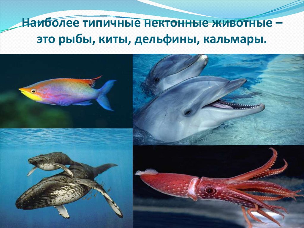 Наиболее типичные нектонные животные –это рыбы, киты, дельфины, кальмары.