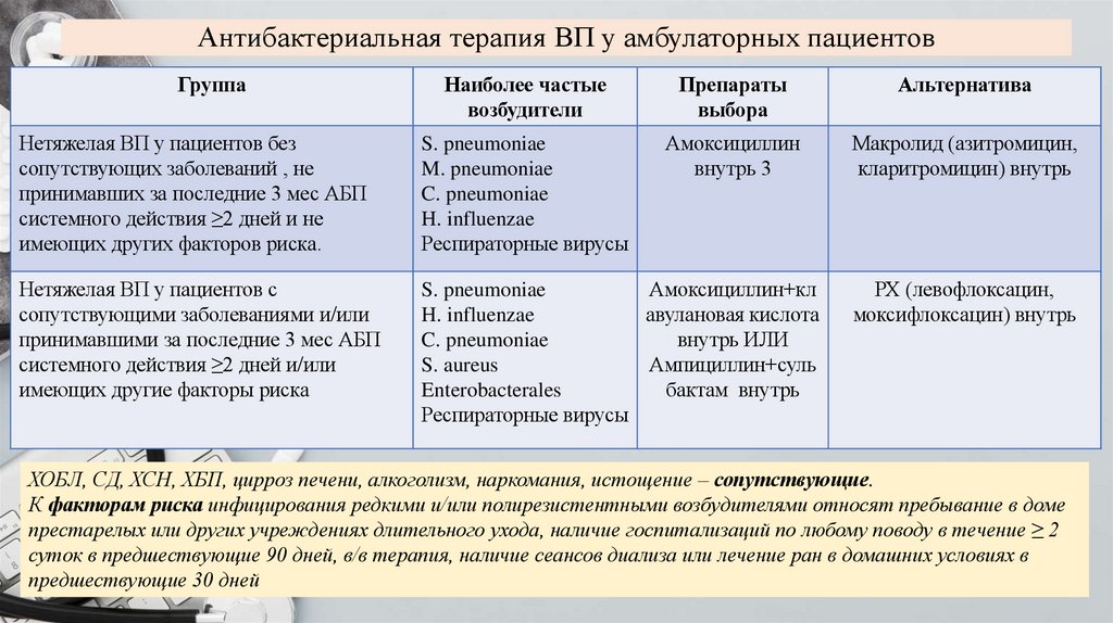 ХОБЛ, СД, ХСН, ХБП, цирроз печени, алкоголизм, наркомания, истощение – сопутствующие.