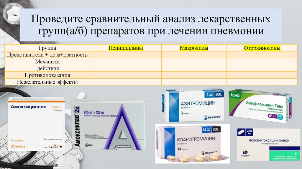 Проведите сравнительный анализ лекарственныхгрупп(а/б) препаратов при лечении пневмонии