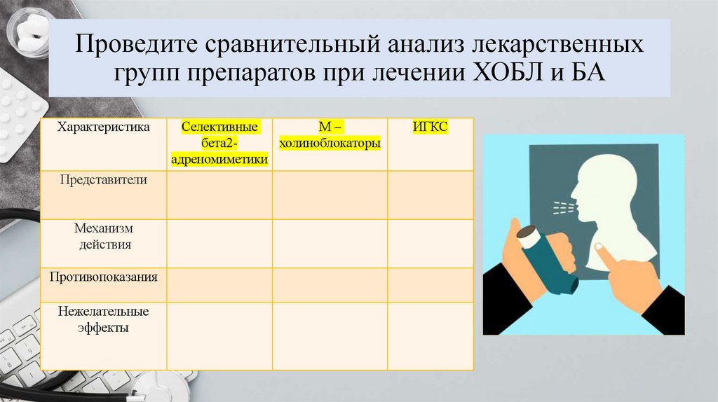 Проведите сравнительный анализ лекарственныхгрупп препаратов при лечении ХОБЛ и БА
