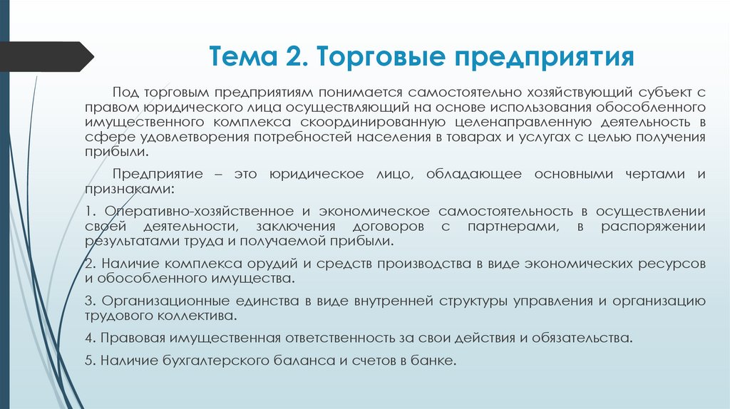 Тема 2. Торговые предприятияПод торговым предприятиям понимается самостоятельно хозяйствующий субъект с