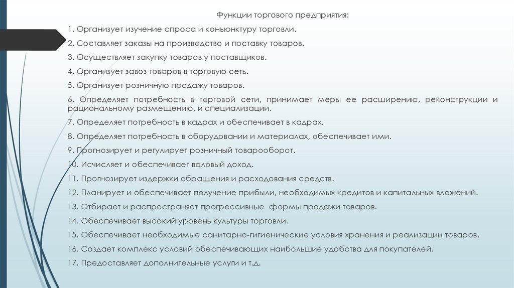 Функции торгового предприятия:1. Организует изучение спроса и конъюнктуру торговли.