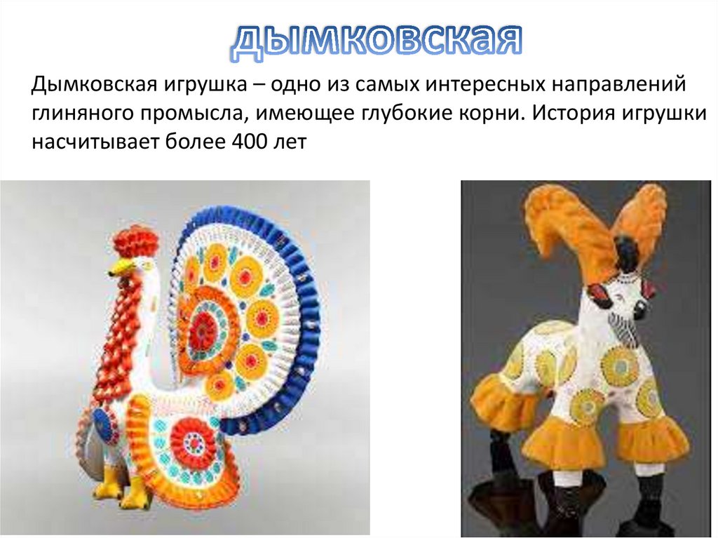 Дымковская игрушка – одно из самых интересных направленийглиняного промысла, имеющее глубокие корни. История игрушки