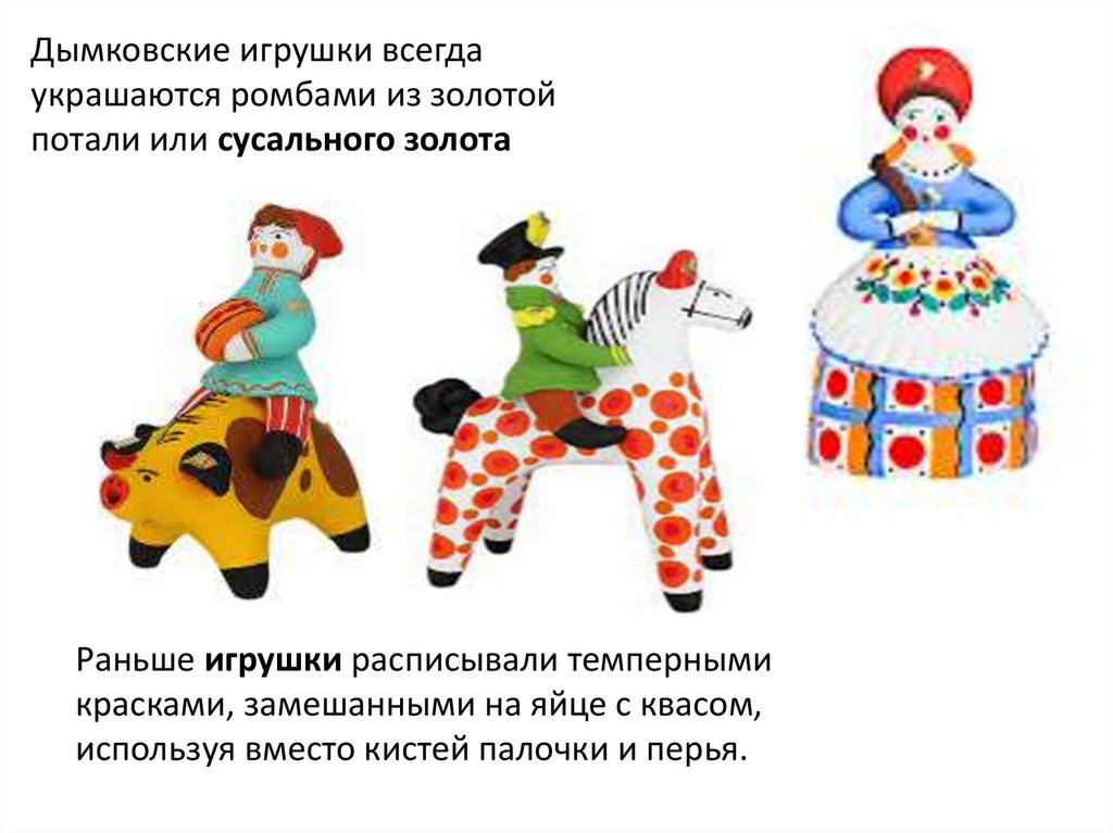 Дымковские игрушки всегдаукрашаются ромбами из золотой