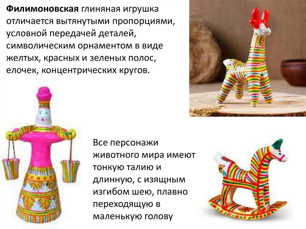 Филимоновская глиняная игрушкаотличается вытянутыми пропорциями,
