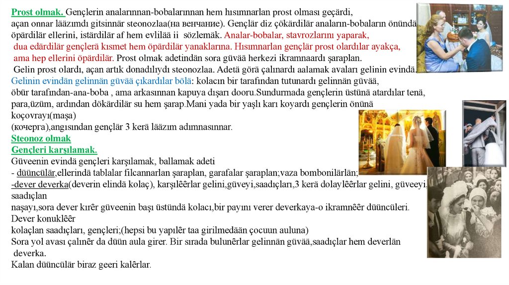 Prost olmak. Gençlerin analarınnan-bobalarınnan hem hısımnarlan prost olması geçärdi,açan onnar lääzımdı gitsinnär steonozlaa(на венчание). Gençlär diz çökärdilär anaların-bobaların önündä,