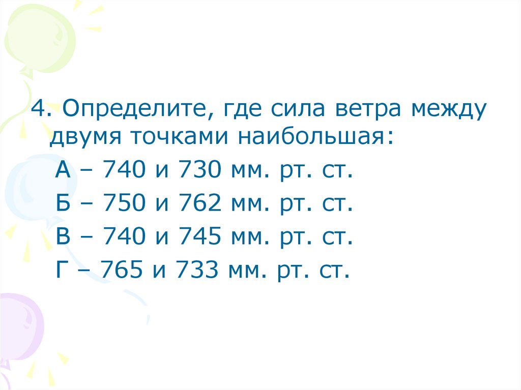 4. Определите, где сила ветра междудвумя точками наибольшая:
