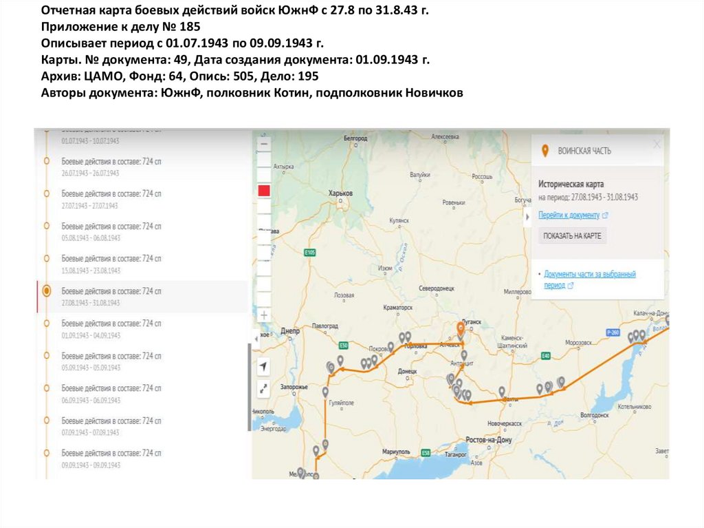Отчетная карта боевых действий войск ЮжнФ с 27.8 по 31.8.43 г.Приложение к делу № 185