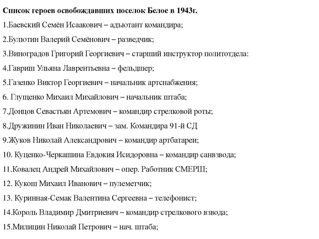 Список героев освобождавших поселок Белое в 1943г.1.Баевский Семён Исаакович – адъютант командира;
