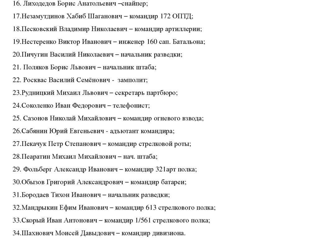 16. Лиходедов Борис Анатольевич –снайпер;17.Незамутдинов Хабиб Шаганович – командир 172 ОПТД;