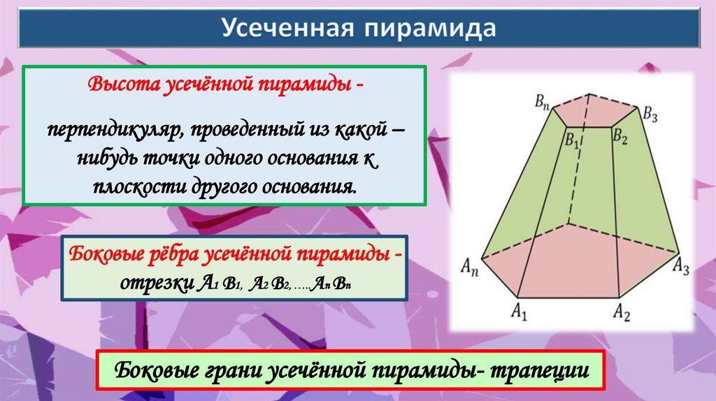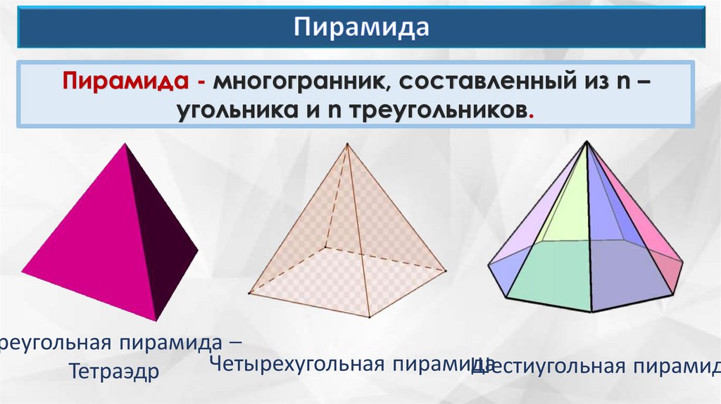 Пирамида - многогранник, составленный из n –угольника и n треугольников.