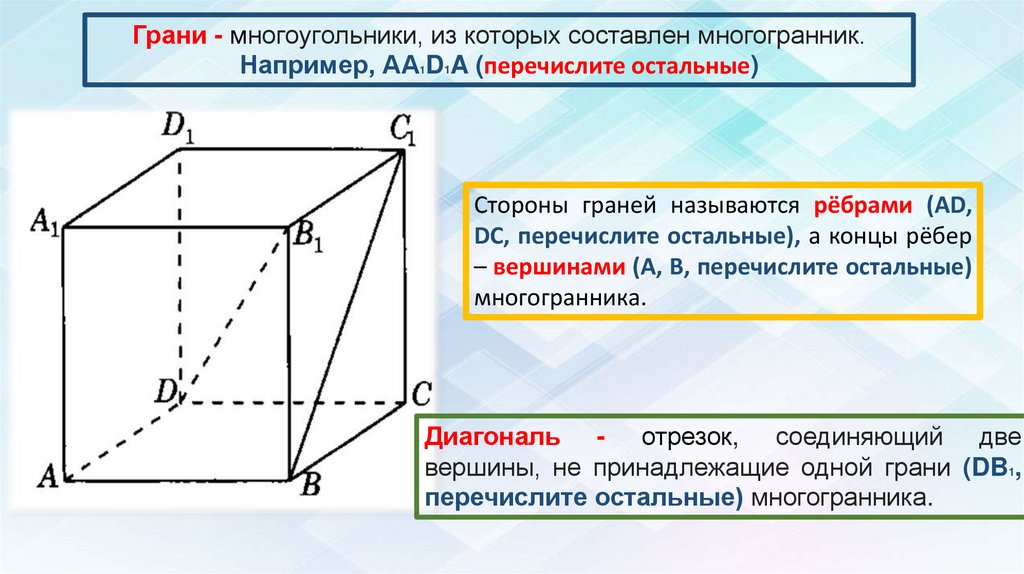 Грани - многоугольники, из которых составлен многогранник.Например, АА1D1A (перечислите остальные)