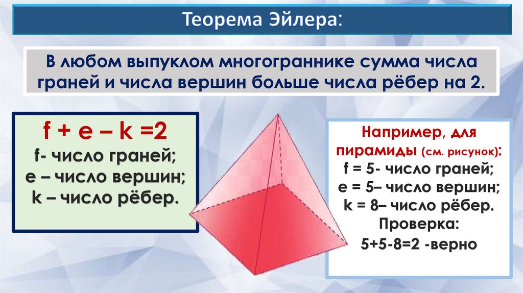 В любом выпуклом многограннике сумма числаграней и числа вершин больше числа рёбер на 2.