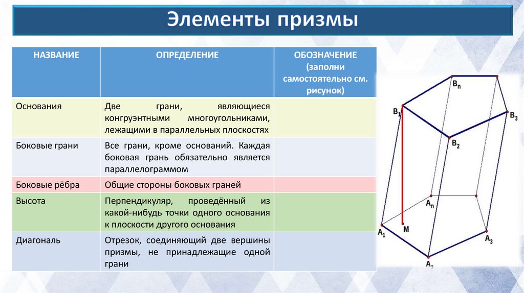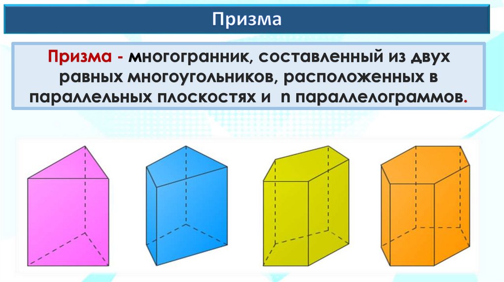 Призма - многогранник, составленный из двухравных многоугольников, расположенных в