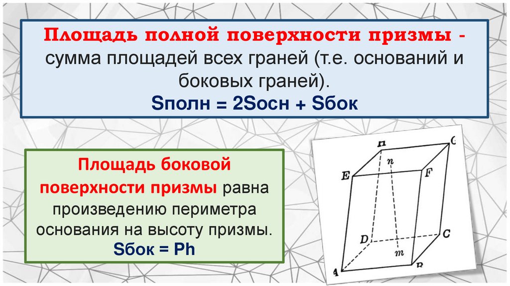 Площадь полной поверхности призмы сумма площадей всех граней (т.е. оснований ибоковых граней).