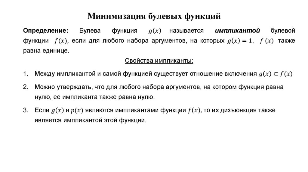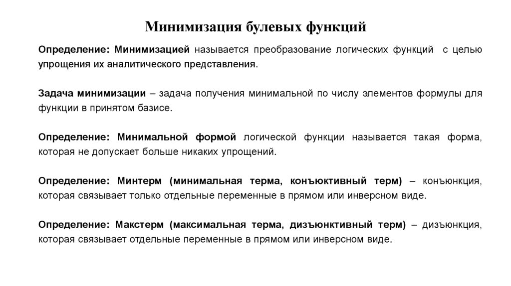 Минимизация булевых функцийОпределение: Минимизацией называется преобразование логических функций с целью
