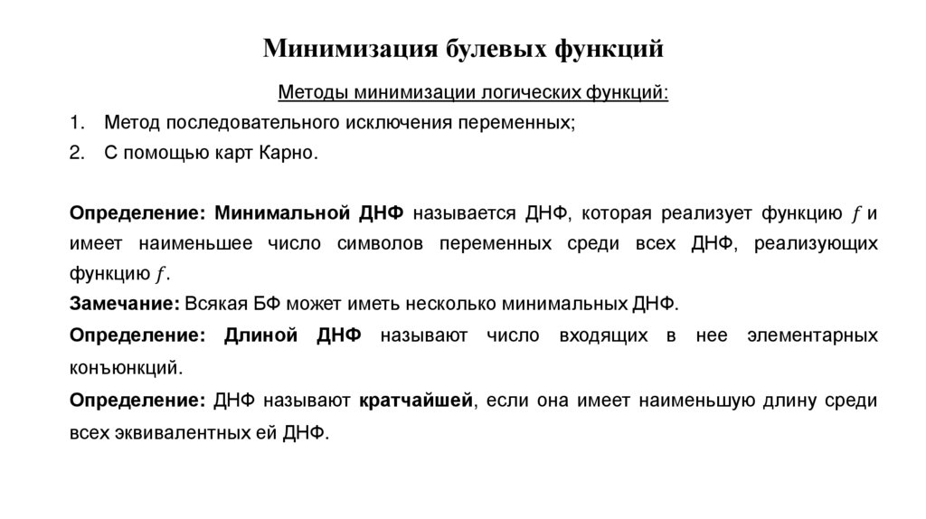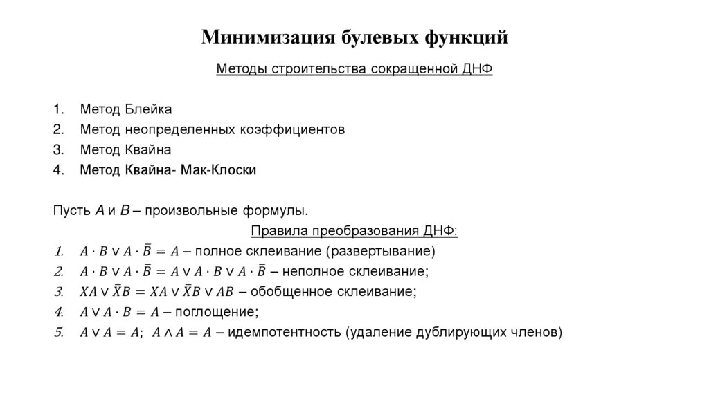 Минимизация булевых функцийМетоды минимизации логических функций: