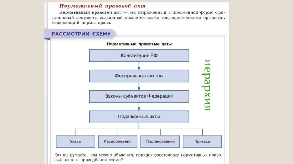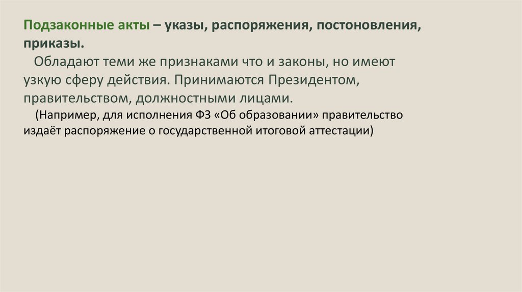 Подзаконные акты – указы, распоряжения, постоновления,приказы.
