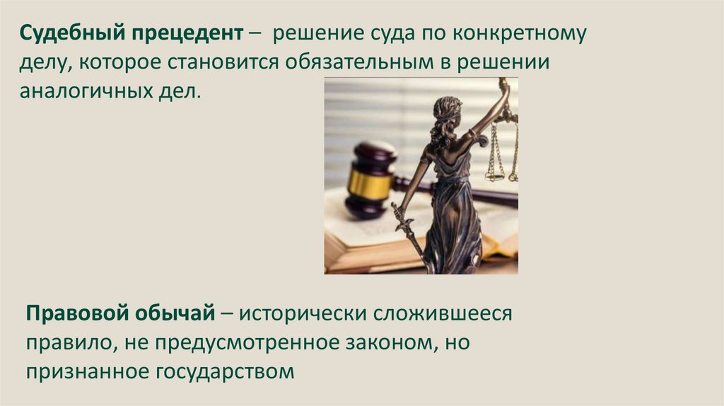Судебный прецедент – решение суда по конкретномуделу, которое становится обязательным в решении