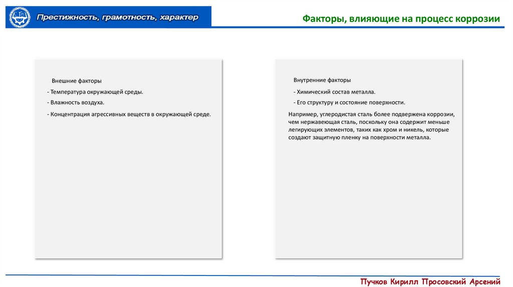 Факторы, влияющие на процесс коррозииВнешние факторы