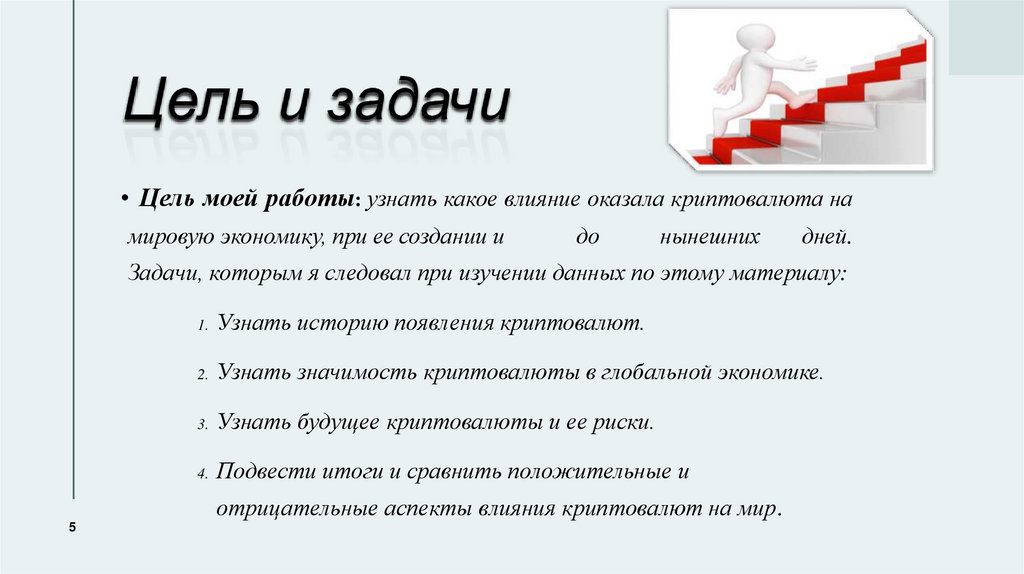 Цель и задачи• Цель моей работы: узнать какое влияние оказала криптовалюта на