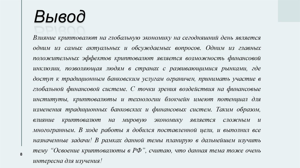 ВыводВлияние криптовалют на глобальную экономику на сегодняшний день является