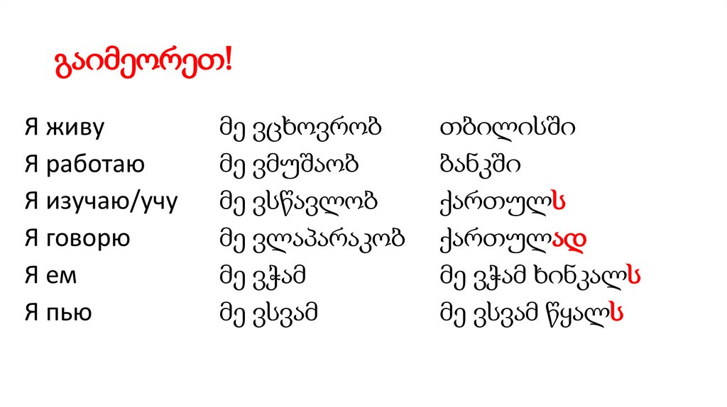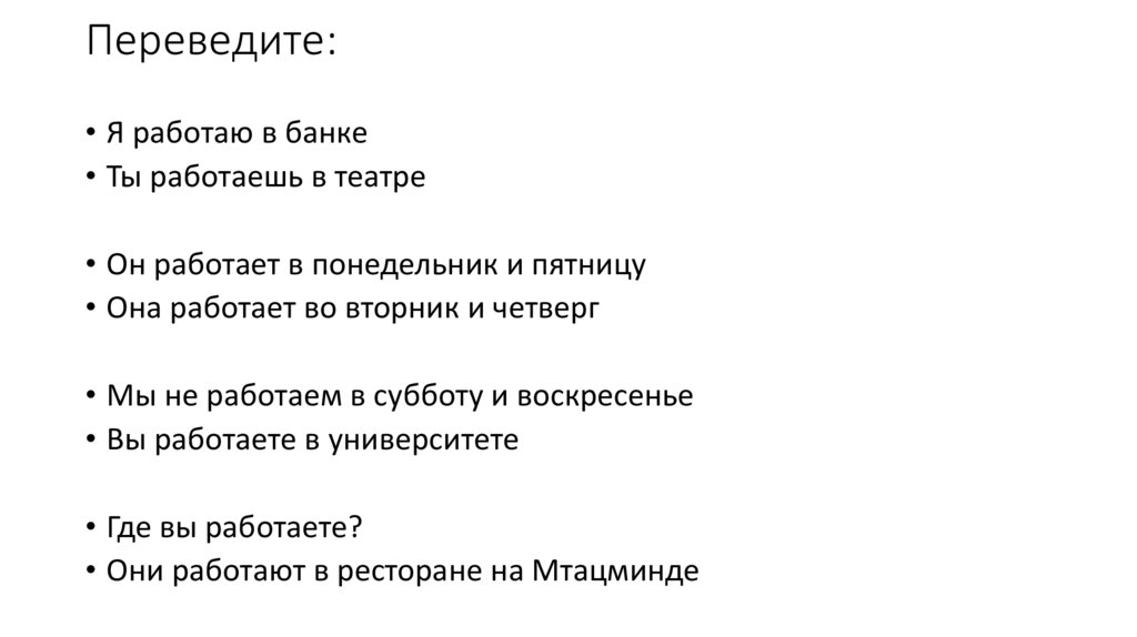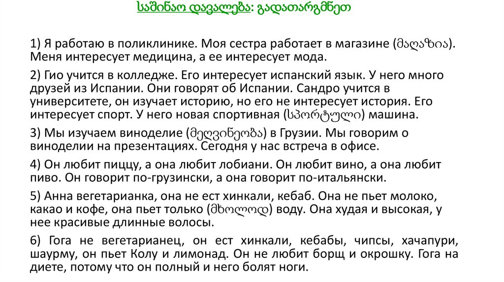 საშინაო დავალება: გადათარგმნეთ1) Я работаю в поликлинике. Моя сестра работает в магазине (მაღაზია).
