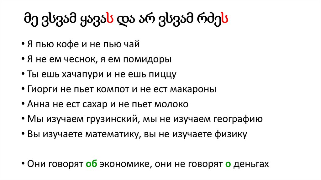 მე ვსვამ ყავას და არ ვსვამ რძეს• Я пью кофе и не пью чай
