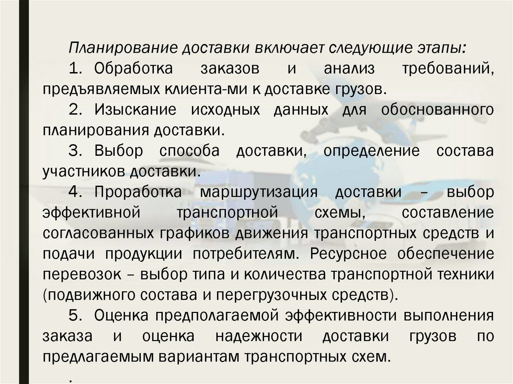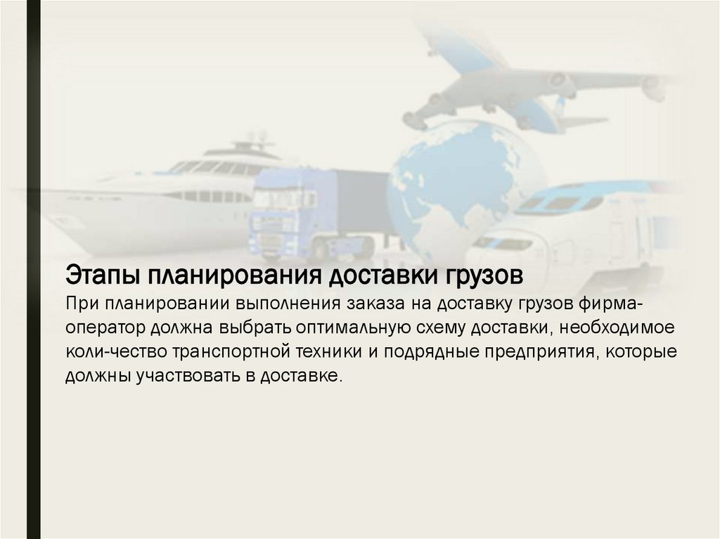 Этапы планирования доставки грузовПри планировании выполнения заказа на доставку грузов фирмаоператор должна выбрать оптимальную схему доставки, необходимое