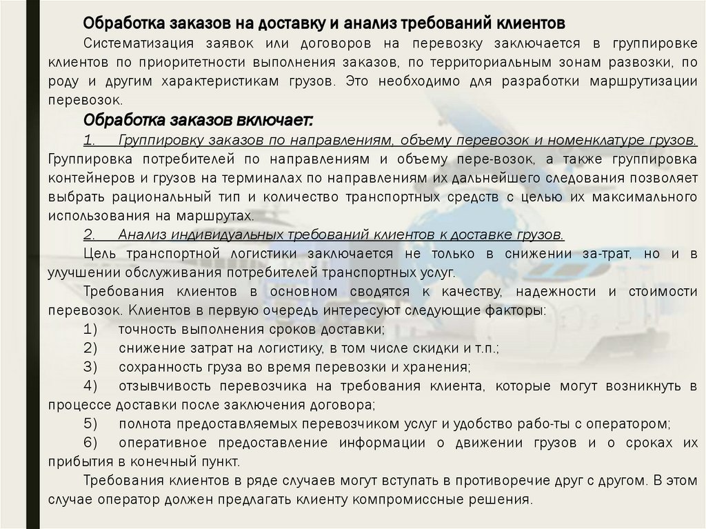 Обработка заказов на доставку и анализ требований клиентовСистематизация заявок или договоров на перевозку заключается в группировке