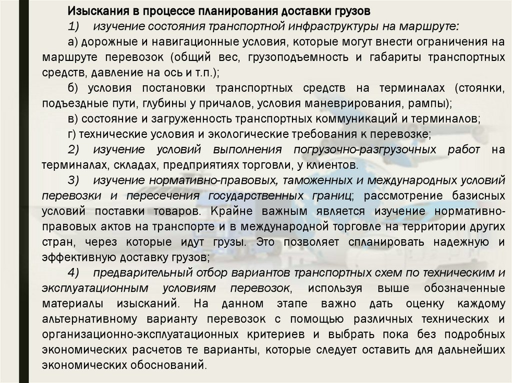 Изыскания в процессе планирования доставки грузов1) изучение состояния транспортной инфраструктуры на маршруте:
