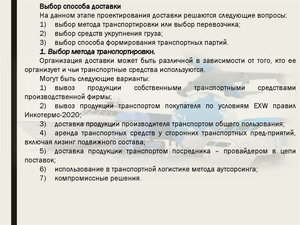 Выбор способа доставкиНа данном этапе проектирования доставки решаются следующие вопросы: