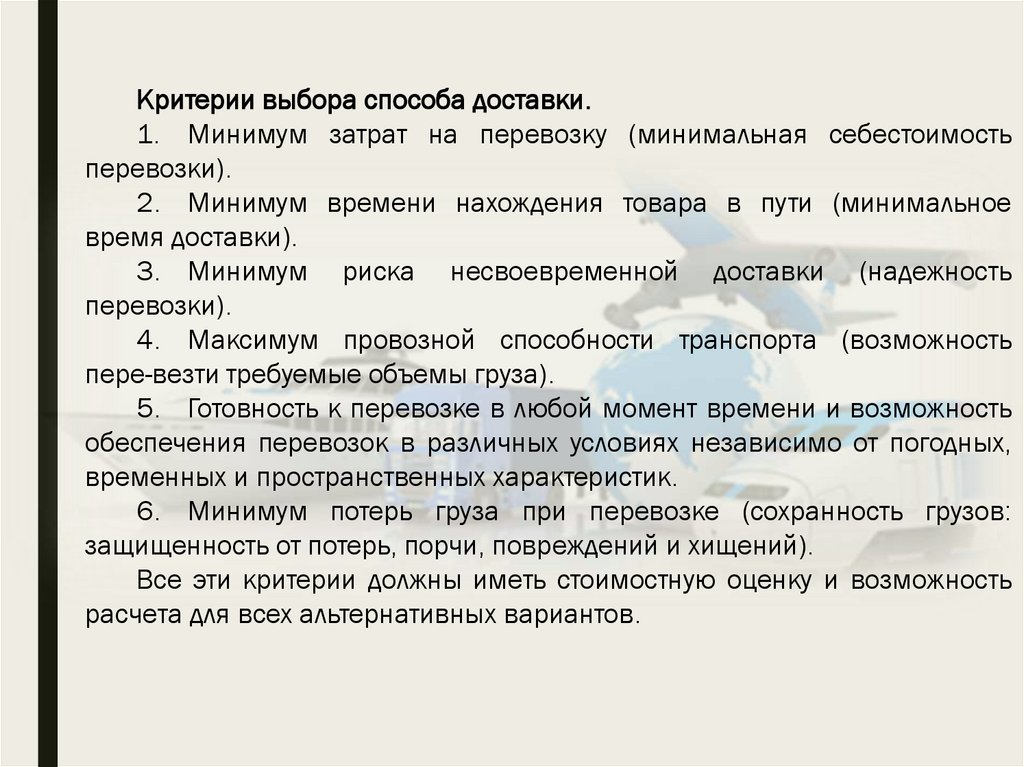 Критерии выбора способа доставки.1. Минимум затрат на перевозку (минимальная себестоимость