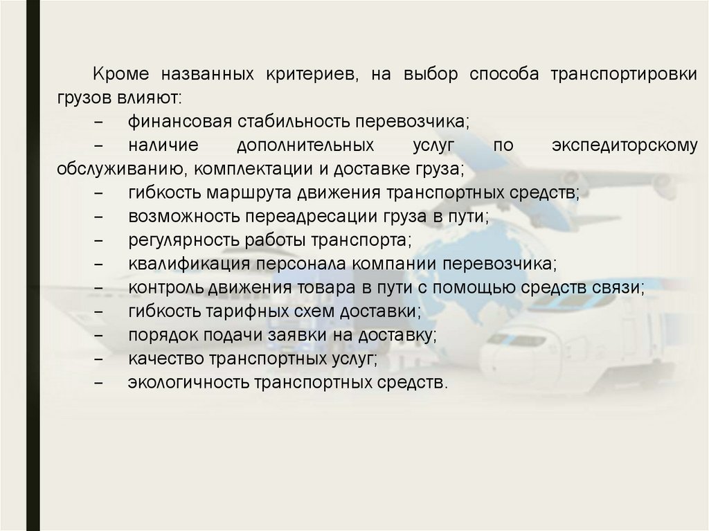 Кроме названных критериев, на выбор способа транспортировкигрузов влияют: