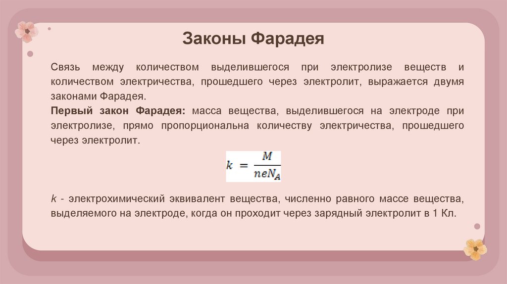 Первый закон Фарадея: масса вещества, выделившегося на электроде при