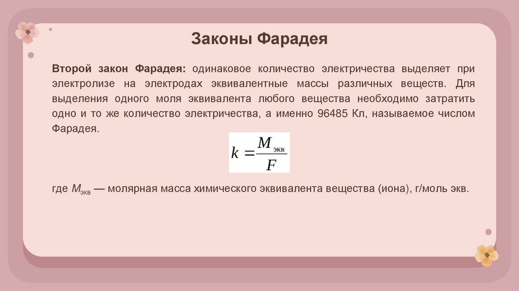 Законы ФарадеяВторой закон Фарадея: одинаковое количество электричества выделяет при