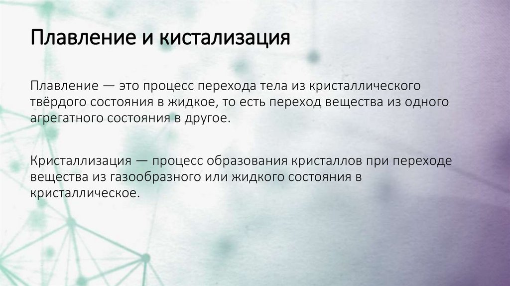 Плавление и кистализацияПлавление — это процесс перехода тела из кристаллического